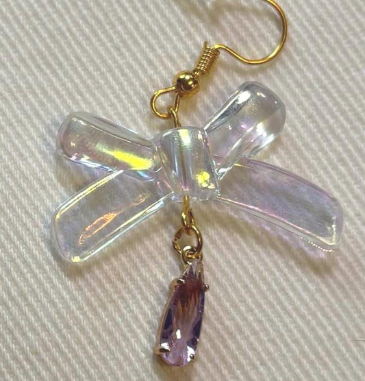 Iridescent bow Earrings, Coquette Floral Earrings, Handmade Beaded Earrings, Cottagecore Earrings Fairycore Handmade Jewelry, y2k Jewelry